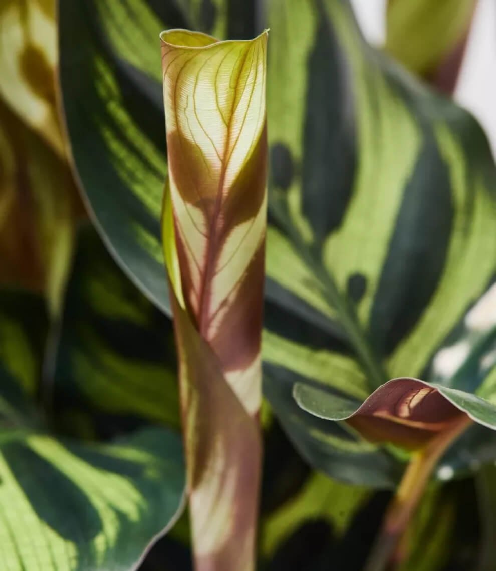 Calathea Pin Stripe or Calathea Ornata are tropical plants with pink pinstripes decorating their large waxy deep green and maroon coloured leaves, which beautifully dance according to the circadian rhythm.